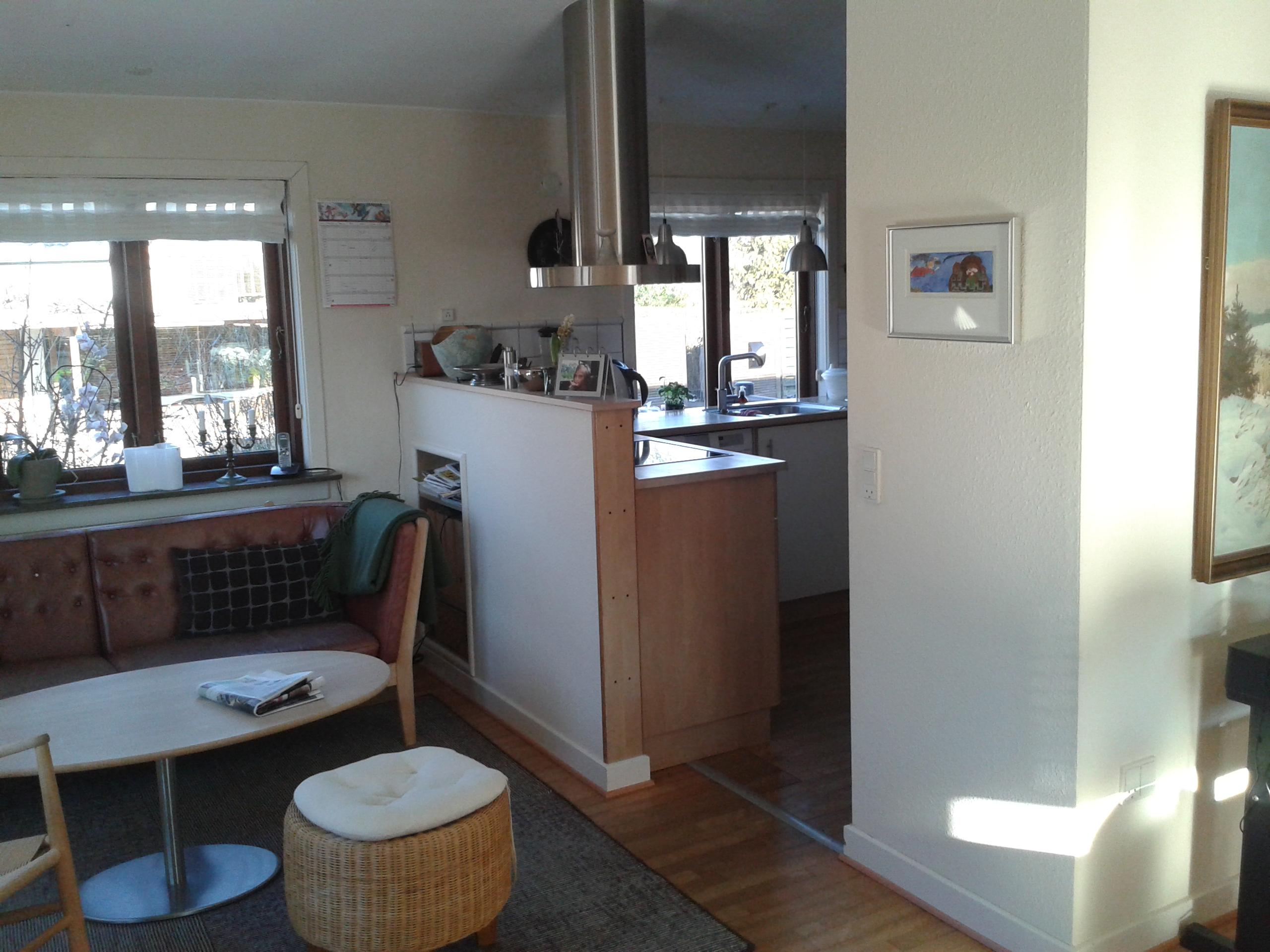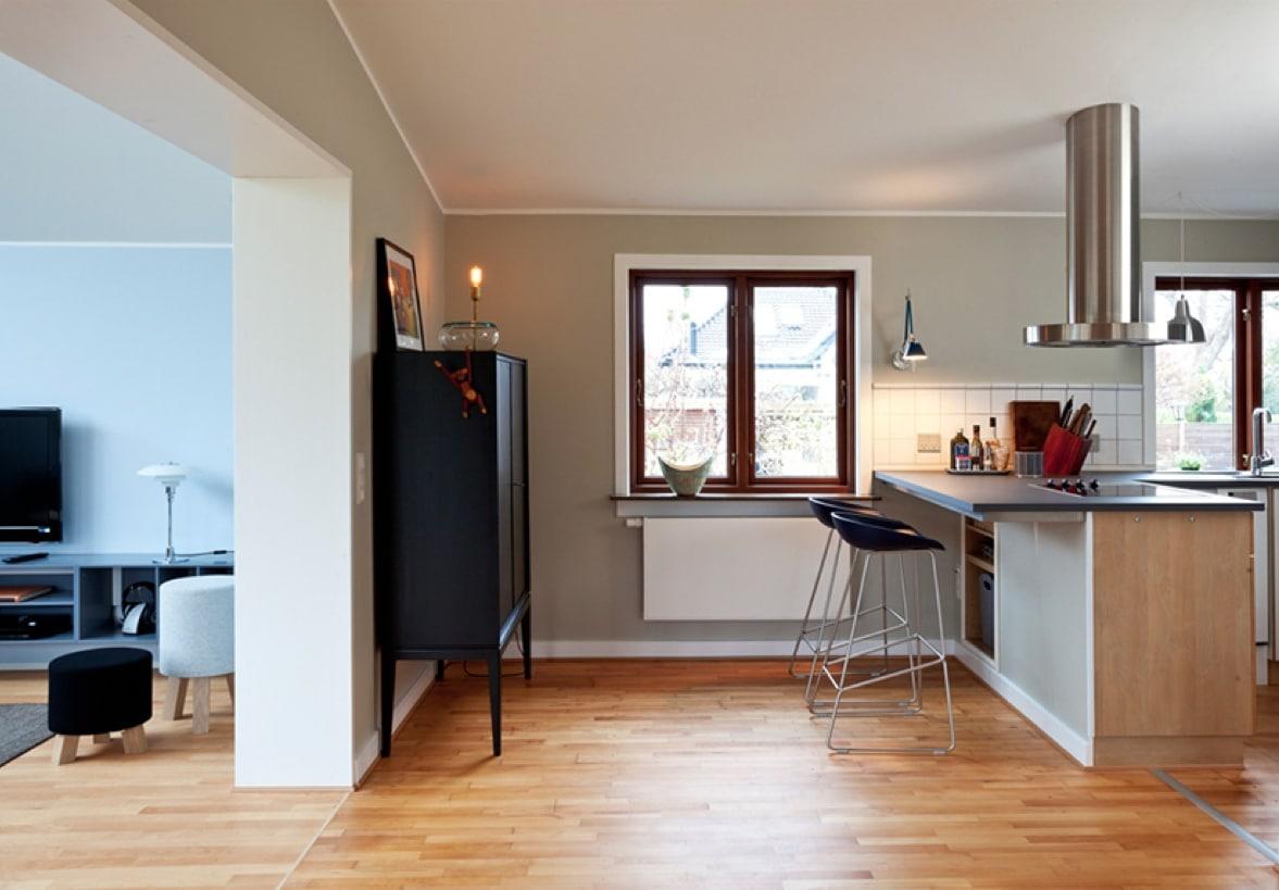 Gardinerne blev fjernet helt for at give mere lys til rummet, og vi fjernede halvvæggen og monterede en ekstra bordplade på kogeøen. Det gør køkkenet til en mere integreret del af stuen og skaber bedre mere sammenhæng mellem rummene. Nu er det lettere at være sammen selvom en skal lave lektier og en anden laver mad.