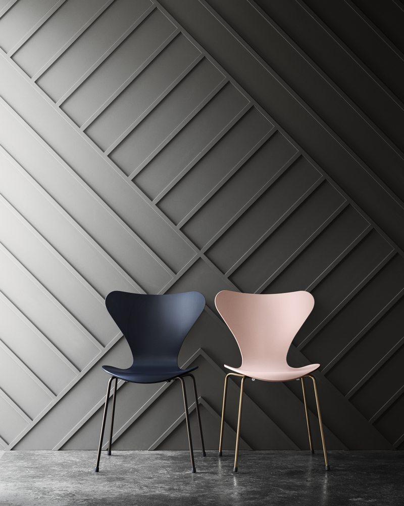 Jubilæumsudgaven af 7´er stolen er inspireret af “modsætninger mødes” – et af hovedtemaerne i indretning og design. Her handler det om kontrasterne i materialer og farver. Den meget mørkeblå og den sarte lyserøde farve står i kontrast til hinanden, men de spiller også op til hinanden og det skaber et virkelig cool elegant look, fordi de både tiltrækker og komplementerer hinanden.