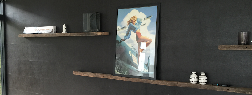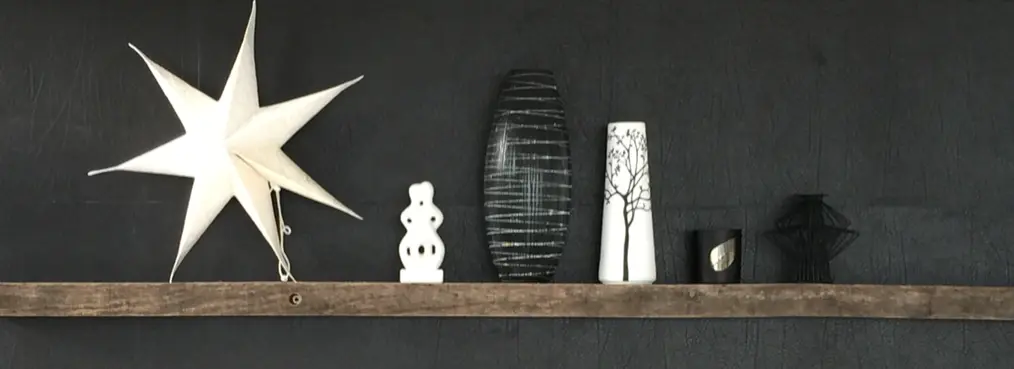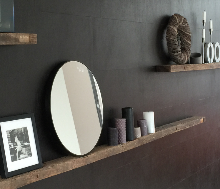 På en af mine konsultationer fangede mit øje denne hylde. For idéen med en lædervæg er enorm spændende og med de rustikke hylder, giver det nemlig en rigtig fed effekt. Men lædervæggen suger desværre også meget af rummets lys og samtidig manglede den mere udtryk. Jeg valgte derfor at vise kunden, hvordan man i højere grad kan anvende hylden til sine nips, så de står flottere. Det er nemlig altid bedre, at samle sine nipseting ét sted frem for, at det brede det ud i karme mv. Her kan de nemt forsvinde og blive ligegyldige.
