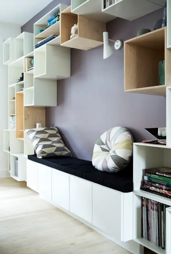 Vægophæng kan monteres på flere måder end bare fladt og firkantet. Man kan lege med dybdestørrelser på hylderne, vinklingen af hylderne og endda funktionen af hylderne. For hvem siger, at de ikke også kan bruges til en smart bænk, hvor der er mulighed for at sidde og samtidig opbevare ting og sager i.