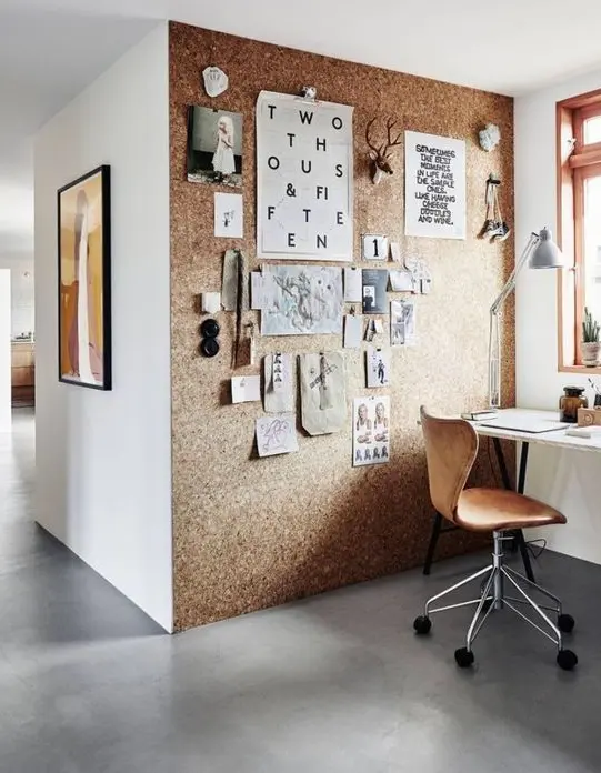 Det er så populært at lave sit eget stilleben med sit personlige galleri. Men man kunne jo gå skidtet videre og beklæde væggen med kork, så den dels bliver mere kontrastfuld i rummet og samtidig giver gode muligheder for variation.