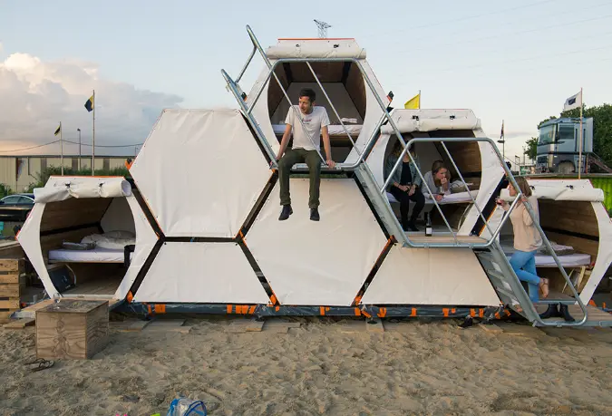 Har du f.eks. nogensinde overvejet at sove i en bikube? B-AND-BEE hedder de smarte celler, der kan stables oven på hinanden, så det til sidst danner noget der ligner en bikube. Her er der tænkt på alt! Ikke alene er der mulighed for at låse dine ting af, mens du er ude og høre koncerter, men du har både lys og mulighed for at få opladt telefonen, hvilket for de fleste er guld værd under en festival.