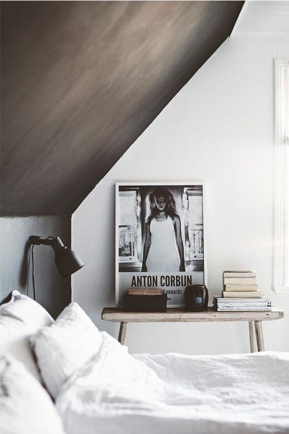 Skab dybde og hygge i soveværelset ved at male skråvæggen i en varm, mørk farve. Det giver både et skarpt look, men samtidig betonet med en varm følelse. Læg mærke til den sorte sengelampe på væggen, som flyder i ét med væggen.