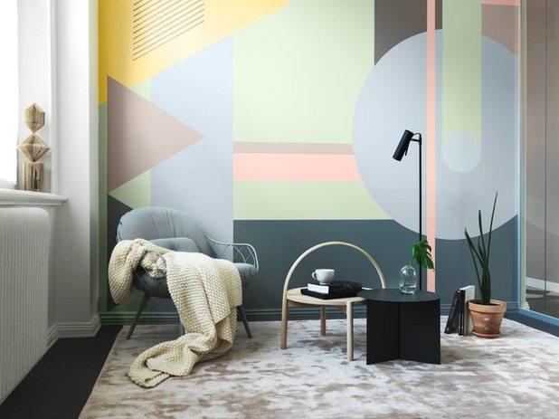 Er du frisk på at give et område af din stue et frisk farvespil, så leg med idéen omkring et grafisk mønster og benyt dig af f.eks. pastelfarver for at skabe en flot sammenhæng. Bemærk at lænestolen har samme nuance blå som farven på væggen og den grønne grundfarve går igen i bord og planter. Det gør, at væggen bliver en integreret del af boligindretningen, og det ikke virker rodet, men tværtimod gennemført.
