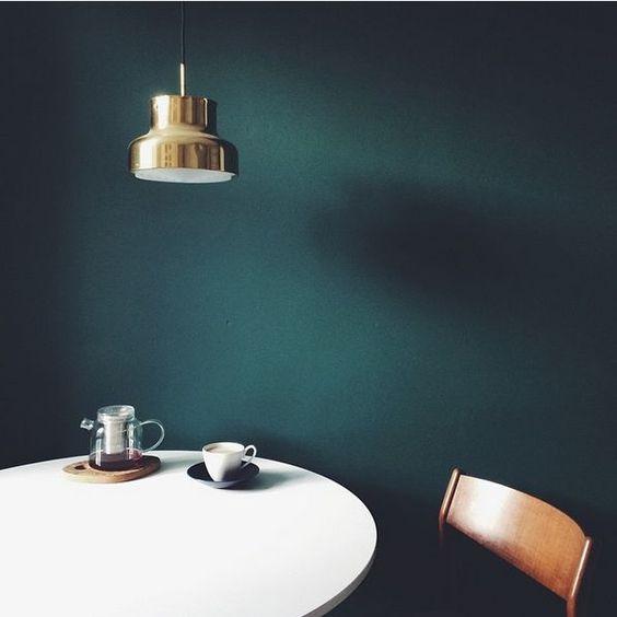 Hvis det skal være enkelt og smukt, så vælg en dyb, smaragd grøn farve og suppler med en guldlampe for at komme med det helt rigtige udtryk ud fra legen med farver i kontrast. Med kun én farve på væggen, der samtidig er en farve der fylder utrolig meget, giver det en ro, men samtidig også en massefylde der gør, at rummet ikke kan bære alt for mange andre møbler. Hold det simpelt.