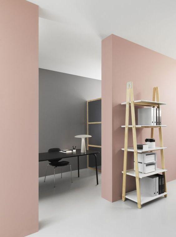 Her ses en smuk farvekombination af rosa afskærmningsvægge der spiller op mod den grå væg i det næste rum. Begge farver i holdes i dæmpede farver, så ingen af rummene fylder mere end det andet. Men jeg kan meget godt lide den måde at farverne deler de to rum op, uden at den ene farve virker mere dominerende end den anden.