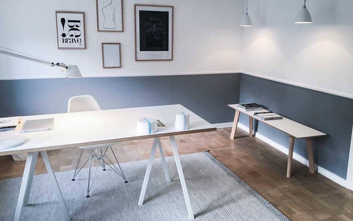 Som jeg tidligere har beskrevet i mine opslag, kan små justeringer gøre en verden til forskel, og det ses tydeligt på disse billeder. Personligt synes jeg, at kontoret på billederne får et mere professionelt og moderne udtryk med den blågrå farve på væggen. Den mørke nuance bidrager til at hele rummet tones ned, således at øjet kan slappe mere af.