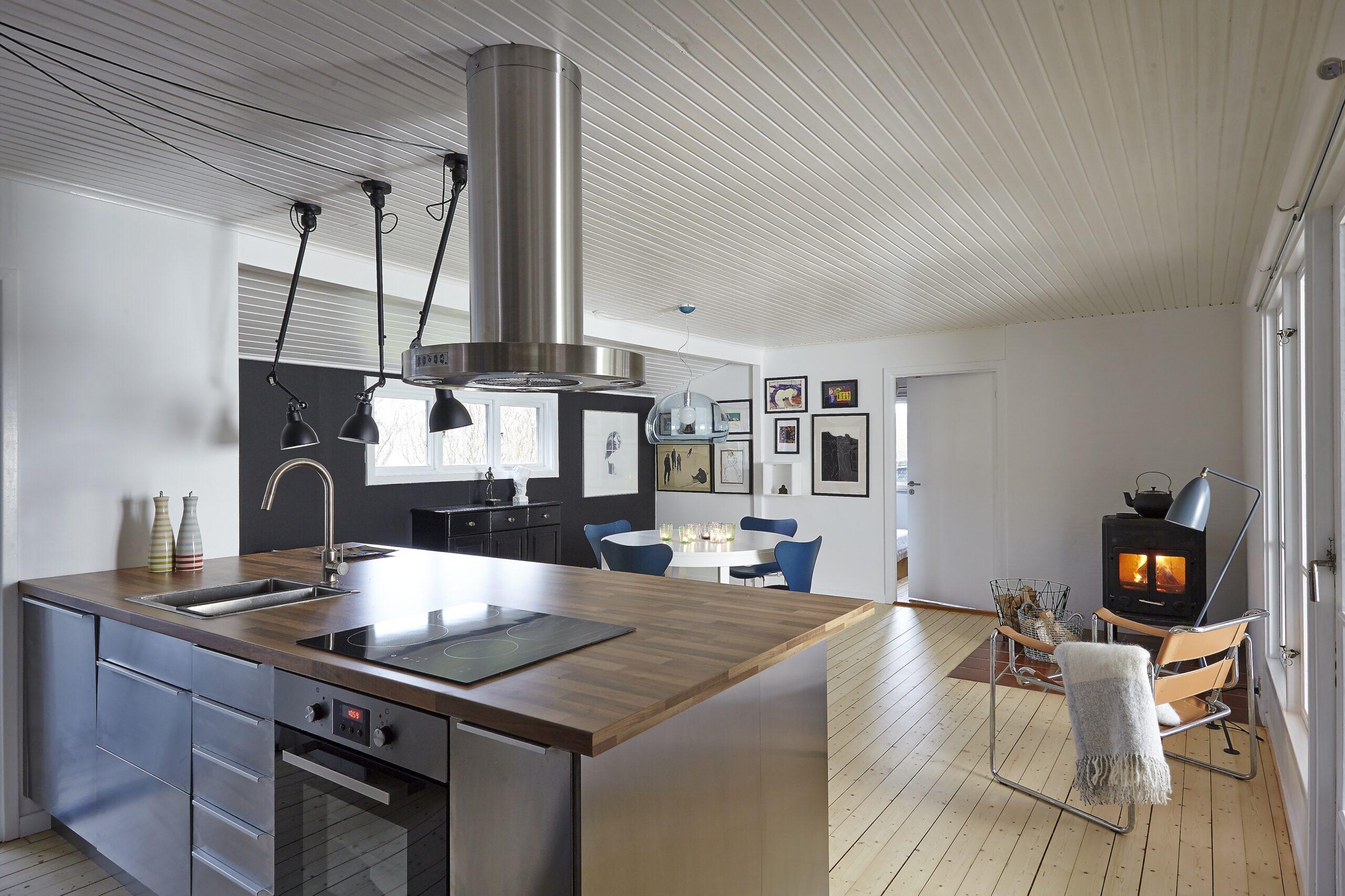 Med disse fordele i tankerne, besluttede jeg at designe køkkenet således, at man står med fronten ud mod stuen, ved betjening af vask og komfur. Køkkenet blev designet i rustfritstål – et rustikt, moderne og industrielt design, som har mødt stor popularitet i hvor tid. Belysningen kommer fra de tre arkitektinspirerede Gras lamper, som kan positioneres efter behov. Dette giver køkkenet lidt flere interessante muligheder for belysning.
