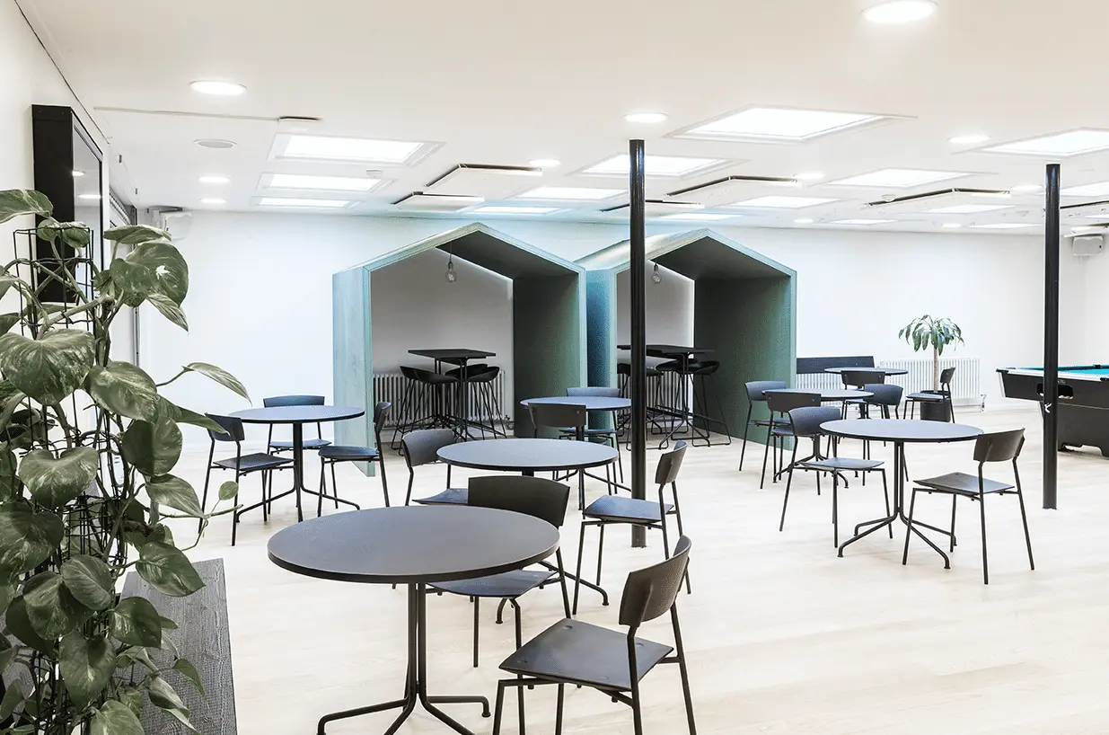 Som du kan læse i mit forrige opslag, xx, som også omhandler design af kantiner, er lys et utroligt vigtigt emne. Et godt og naturtro lys, er optimalt i rum, hvis formål er, at få rummets besøgende til at slappe af. Kantinen havde i forvejen ovenlys vinduer, som klart var en fordel – men jeg valgte alligevel at opgradere alle lamperne med pærer, der har et lysere og naturligere skær. Selvom jeg holder medet af kunst på væggene, valgte jeg dog at tage malerierne ned. Min primære grund for dette tiltag var, at maleriernes udtryk, farver og kontraster var alt for store og modvirkede hinanden. Desuden var alle malerierne malet med mørke nuancer, hvilket betød at de trak meget luft og lys ud af rummet.