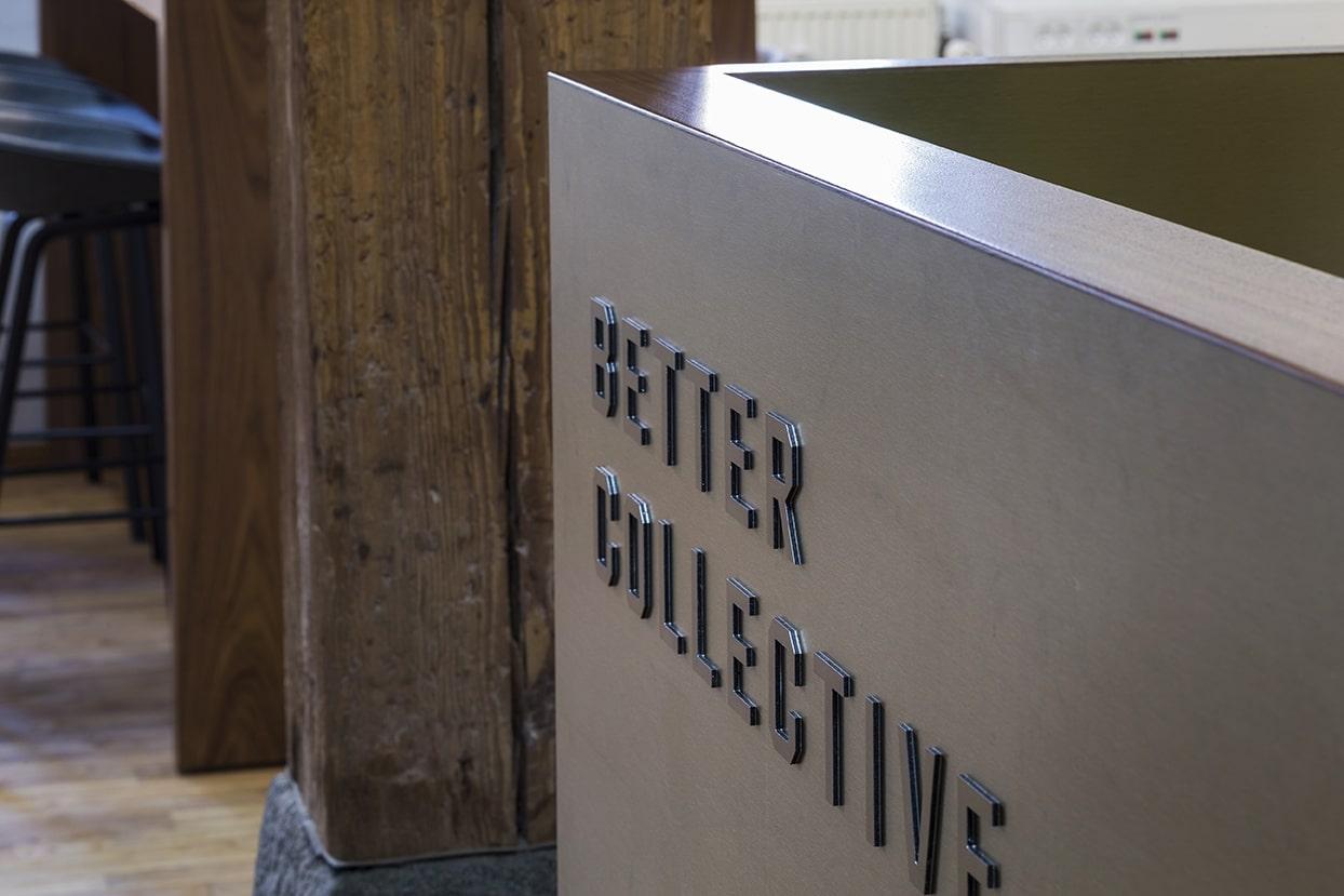 For et professionelt firma som Better Collective, er det vigtigt at signalere faglig dygtighed og høj kvalitet til deres klienter. Med dette i tankerne, valgte jeg at designe receptionen med en masse luft imellem de enkelte komponenter for at give møblerne mere tyngde i rummet – og dermed også et højere udtryk af kvalitet. I forlængelse af dette, føltes det naturligt at vælge nogle komfortable stole med et voluminøst og moderne design, så de virker indbydende og ophøjer brugeroplevelsen hos firmaets klienter. De kraftige og solide søjler forblev urørte, for at bevarer et fint og historisk udtryk i lokalet – ydermere går deres naturlige brune farve godt i spænd med naturfarver, hvorfor jeg valgte at designe receptiondisken i en grøn nuance og endvidere dekorere væggene med planter. Ved at bevare disse naturlige elementer, skabte jeg et harmonisk samspil, der har et rustikt og oprigtigt udtryk. Dette komplimenteres af de mere simple elementer i rummet, som den elegante vandpost og de stilfulde vægdekorationer, som giver de besøgende et mere raffineret og fint indtryk.