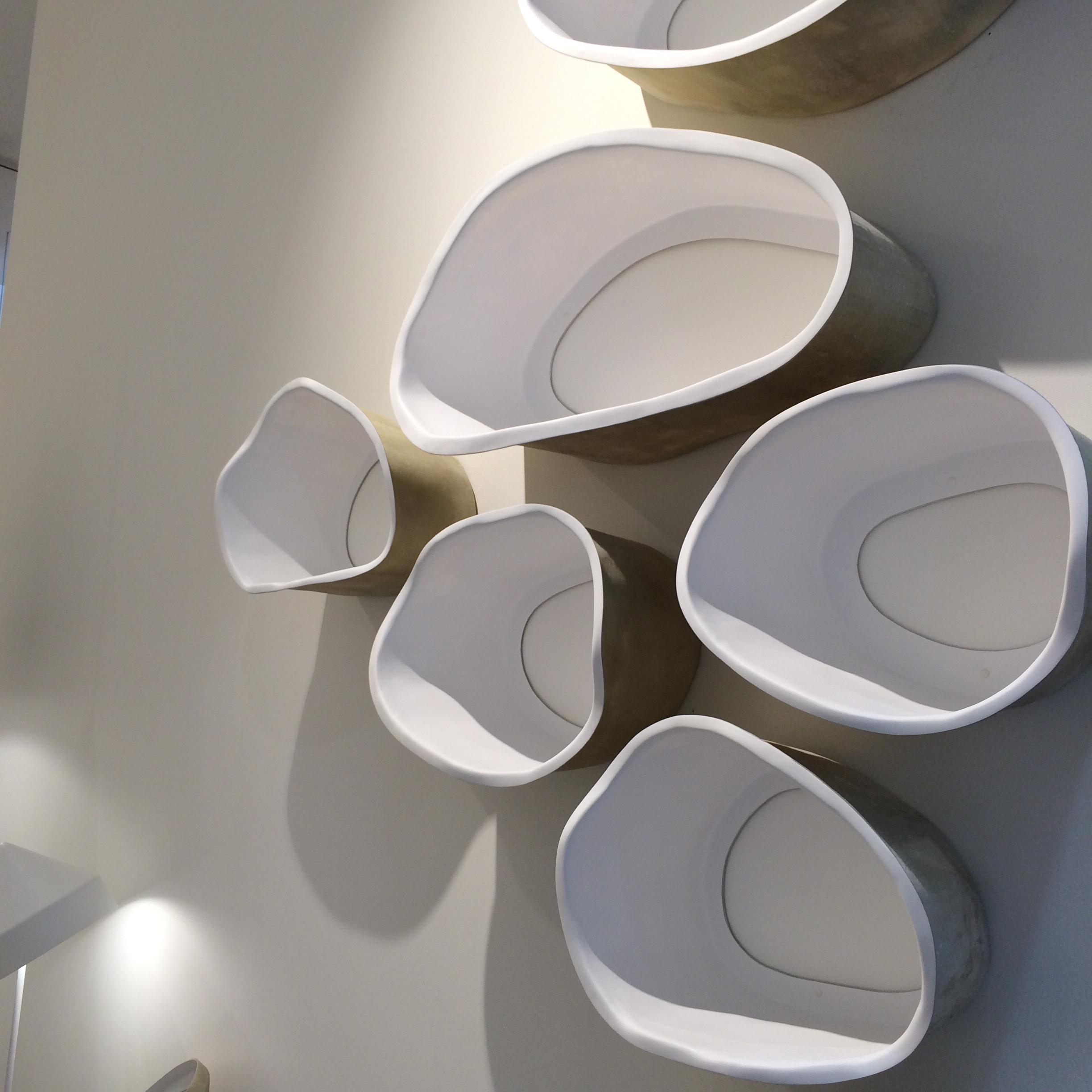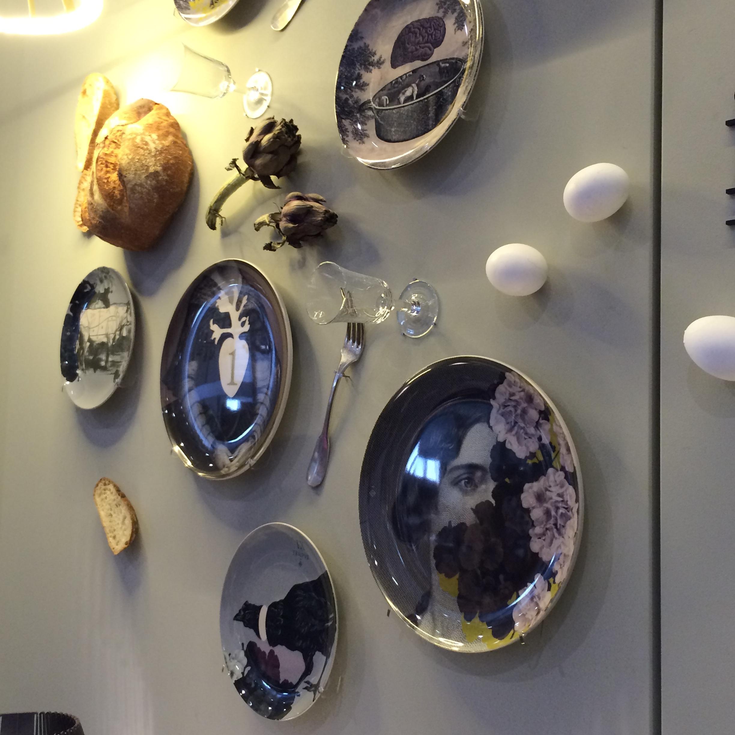 Jeg fandt en masse cool vægudsmykning. De er alle ret forskellige men meget kunstneriske og specielle. Det er former, struktur, farver og brug af elementer i en helt anden kontekst – fx som servicet, der nu hænger i stedet for at stå på et bord, som normalt.