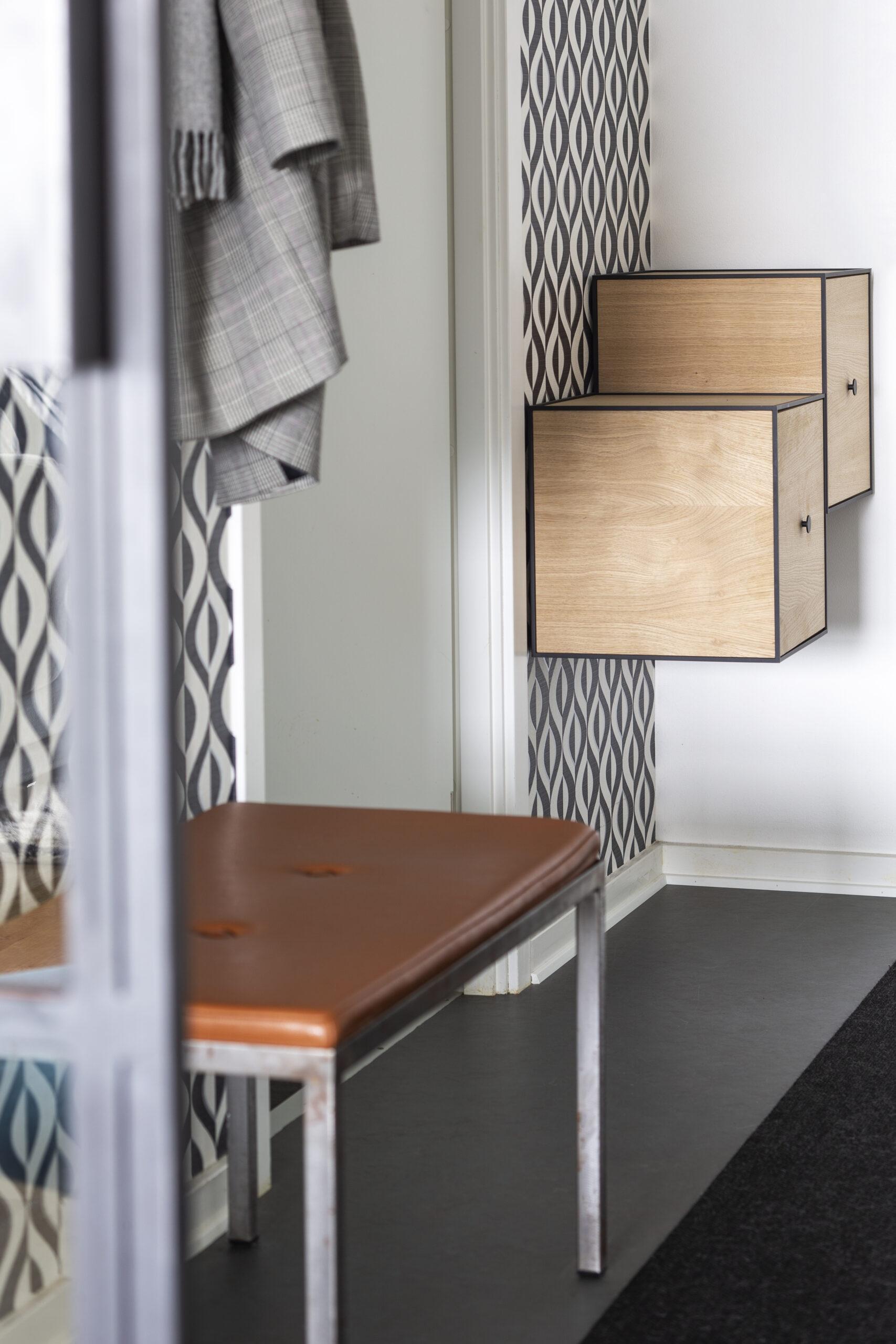 Med de smarte løsninger, som hjul under bænken, bænken der er udnyttet med indbygget opbevaring og benyttelse af højden med en hattehylde, kan du opnå funktionaliteten uden at skulle gå på kompromis med designet.