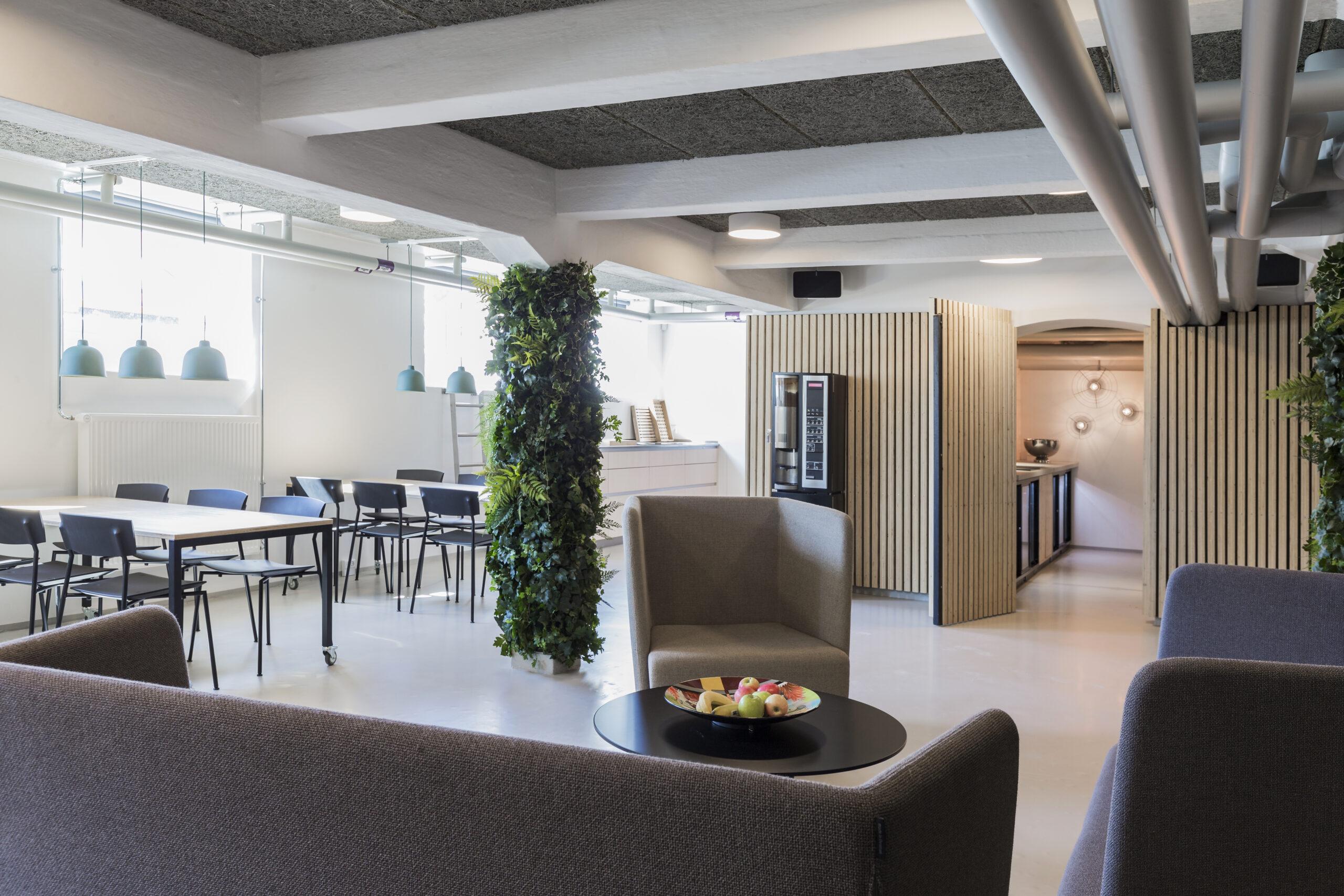 For at kompensere for de (i nogens øjne) lidt kedelige hvide vægge, havde jeg mange visioner for at gøre rummet mere dynamisk mht. indretningen. Det kommer især til udtryk på søjlerne, som blev udsmykket med en masse grønne slyngplanter fra Kontorbeplantningen – og som i den grad bidrager med et unikt udtryk til kantinen. Disse planters farver underbygges med lyse naturfarver i bjælkerne som beklæder nogle af kantinens vægge. Disse bjælker vil i øvrigt også bidrage med en hyggeligere stemning til vinter, når rummet i højere grad oplyses af lamperne.