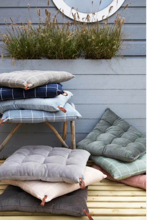 Snart er udendørssæsonen for alvor i gang, og der går altså ikke længe før, at der skal nydes kold hvidvin og grillmad på terrassen i aftensolen. Pynt terrassen med fine hynder i forskellige sarte nuancer og enkle mønstre.