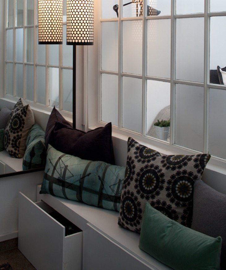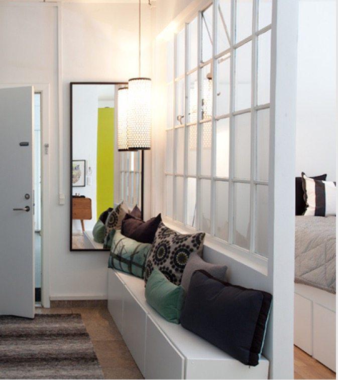 Væggen indtil soveværelset og stuen – er en væg af ruder. De nederste er matterede og kun de øverste er klare. Det giver lidt privatliv i soveværelset som ligger på den anden side af entrevæggen.