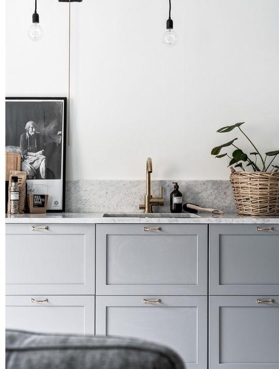 Hvis budgettet hverken er til maling eller en ny bordplade, er det værd at overveje en ny hane, gerne i messing. Den har et retro-look som jeg rigtig godt kan lide. Man får lov til at lægge mærke til den, Selv på lang afstand – Hvilket jeg synes er så fedt! Og så må den da gerne matche en lille lampe du har stående, eller grebene på lågerne.