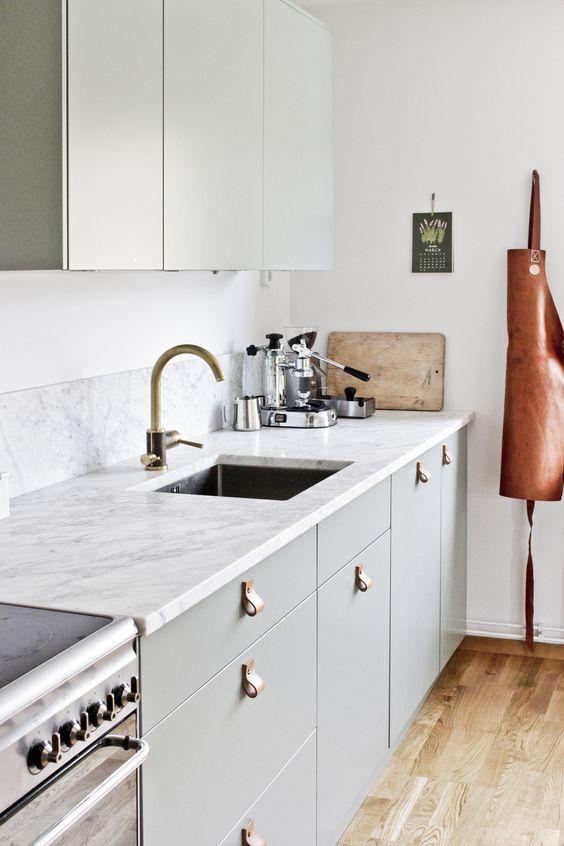 Her er et fedt eksempel på, hvordan man har beholdt de klassiske køkkenlåger, men givet dem et nyt greb i læder. Og bordpladen i marmor tilføjer et eksklusivt element til køkkenet, der får det til at se lidt mere lækkert ud.