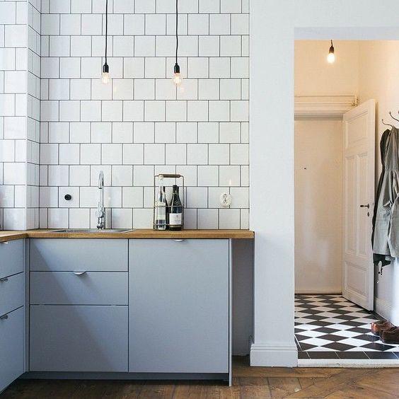 Få det industrielle look med hvide fliser hele vejen op ad væggen. Brug den rå ledning og pærer til at give det kant og personlighed. Det giver samtidig også et fantastisk arbejdslys ved køkkenbordet.