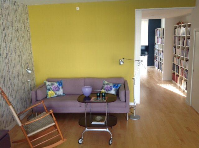 Helheden blev bundet sammen med et flot tapet og den lilla sofa står virkelig frækt til den limefarvede væg. De to farver komplementerer hinanden godt – men det er en løsning med kant.