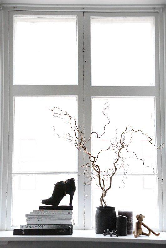 - Skal du style en lang vindueskarm kan du i stedet for at sprede dine pyntegenstande i hele vinduet, samle det i 2 dekorationer. Det giver ro og balance i din vindueskarm.