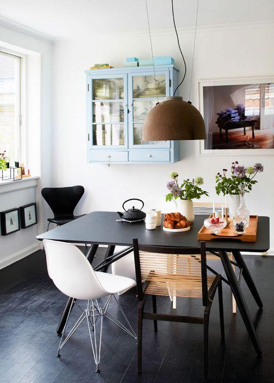 Det behøver ikke at være den samme stol du har stående 6 af ved spisebordet. Bland gerne forskellige stole som her på billedet. Det er sjovt, anderledes og så kan du få lov til at sidde i din yndlingsstol, uden at gå på kompromis med andre.