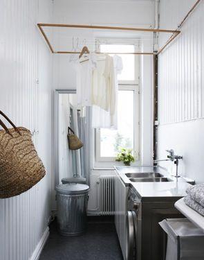 I stedet for at bruge gulvplads på at have et tørrestativ stående, er det en god idé at få sat tørresnore op under loftet. Man kan få mange rækker, og det giver en masse god tørreplads i vaskerummet. Det kan nemt klares med nogle kroge og en tørresnor, som man binder op. Man kan også få specielle tørrestativer, som er beregnede til at sætte op under loftet.