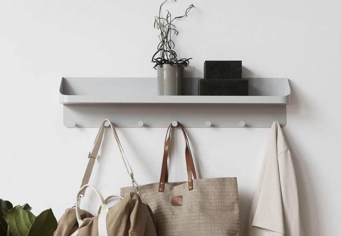 Der skal være plads til småting i en entré. Fx en fast plads til nøgler, cykellygter, håndcreme og andre småting man kan få brug for på vej ud ad døren. Herunder ses to forskellige løsninger, der giver opbevaringsplads til småting. Den ene løsning er en knagerække med en lille indbygget hylde over knagerne. Det er den perfekte løsning, hvis du bare lige skal have et sted til nøgler og solbriller. Det kan også se super dekorativt ud, hvis du sætter en lille plante eller andet på hylden.