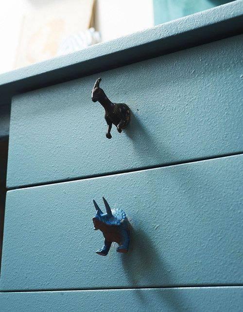 Ved at skrue de gamle greb af en kommode og installere nogle nye kan du meget nemt give kommoden nyt liv. I dag får du et hurtigt tip til, hvordan du kan ændre udseendet på dit barns kommode og/eller skab ved at give dem nogle nye greb, der er sjove og anderledes. På barnets værelse kan du gøre kommoden mere barnlig og sjov ved at bruge nogle dyrefigurer som greb. For at lave de greb, som er vist på billedet nedenfor, skal du blot bruge et par legetøjsfigurer, som du skærer over på midten. Derefter borer du dem fast til skuffen og voila – så har kommoden fået et helt andet udtryk end den havde før. Hvis du vil ændre yderligere på kommodens udtryk, kan du male både kommode og greb i en frisk farve, der er iøjnefaldende og personlig.