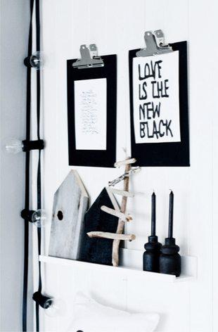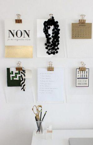 Hvis du vil have et mere rustiks udtryk, så brug enten en træplade eller et stålgitter som selve ophængningsfladen. Så kan du bruge klemmer, bøjler, tegnestifter eller farvet tape til at sætte tingene op med.