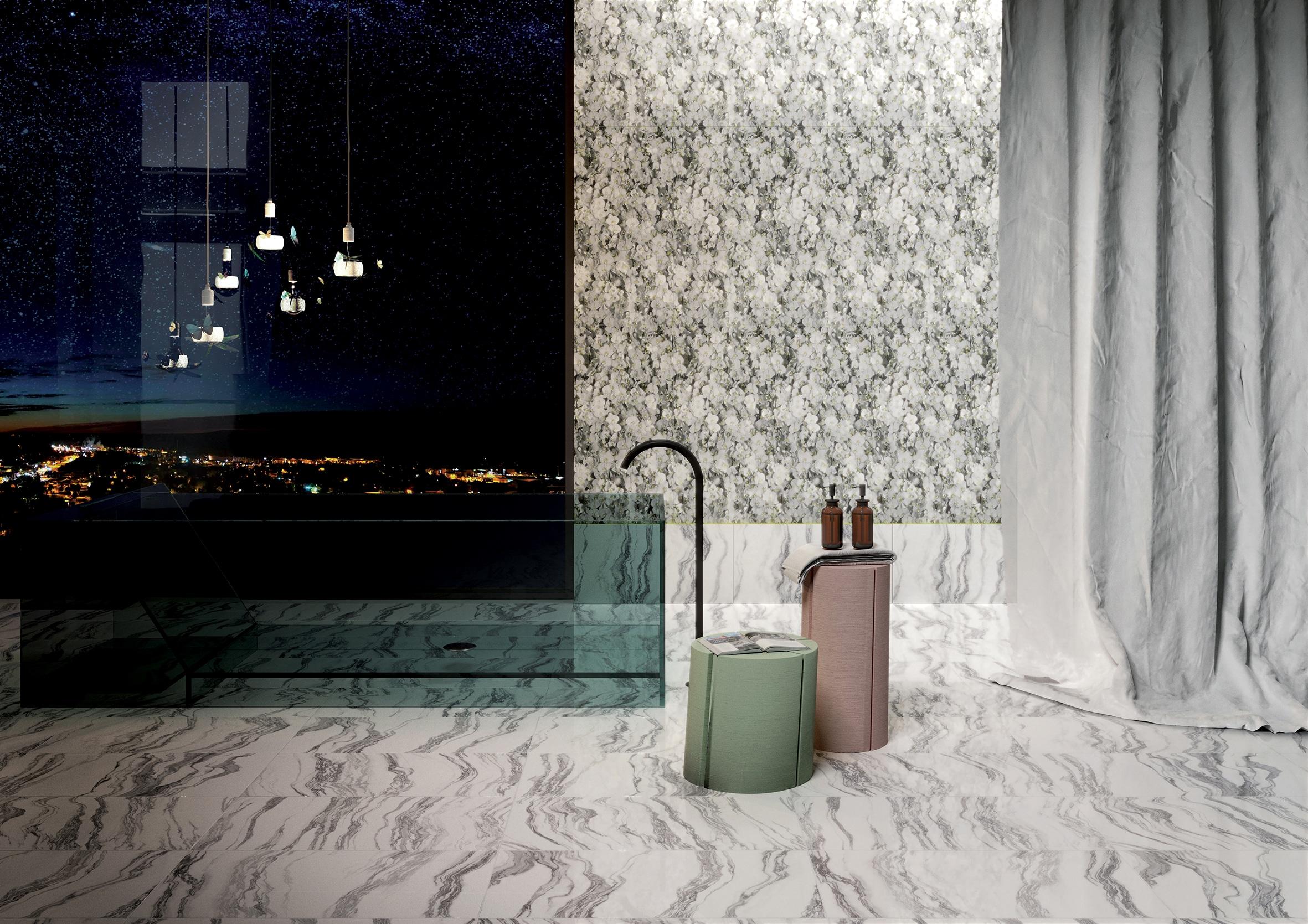 Behændigt sammensat – Italienske fliser med marmoreringer i et spændende mønster på badeværelset.