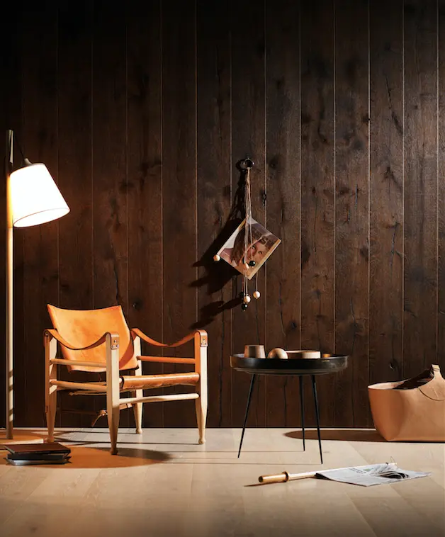 Den mørke træbeklædning der dominerer rummet, sætter en stærk kontrast til det lækre og lyse trægulv fra Garant, der fylder rummet ud og viser, hvor stort rummet er. Med den mørke væg bliver rummet rammet ind, der tilfører en ekstra kant og hygge.