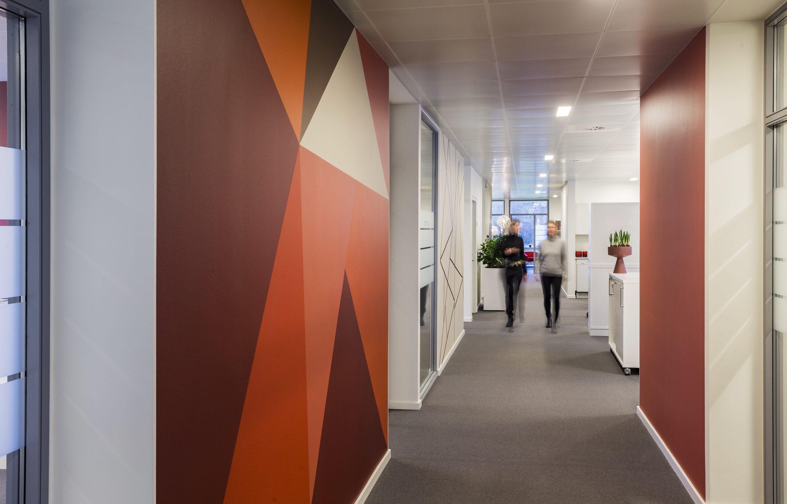 Farverne valgte jeg i røde nuancer, for at give væggene et mere kreativt touch, som medvirker til at skabe en wow-effekt for firmaets gæster og kunder. De rødlige farver står i skarp kontrast til firmaets i forvejen hvide vægge, og bringer derved meget liv til rummet.