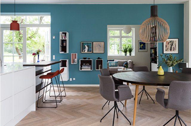 Det sikre valg er ofte hvide vægge, som passer til alt. Men er du modig, vælger du en af de nye vægfarver, der kan være alt fra en sart pastel, en dyb grå eller feks havgrøn.