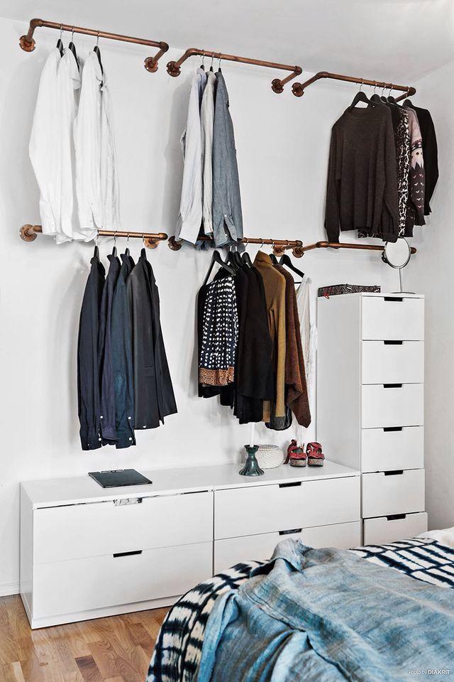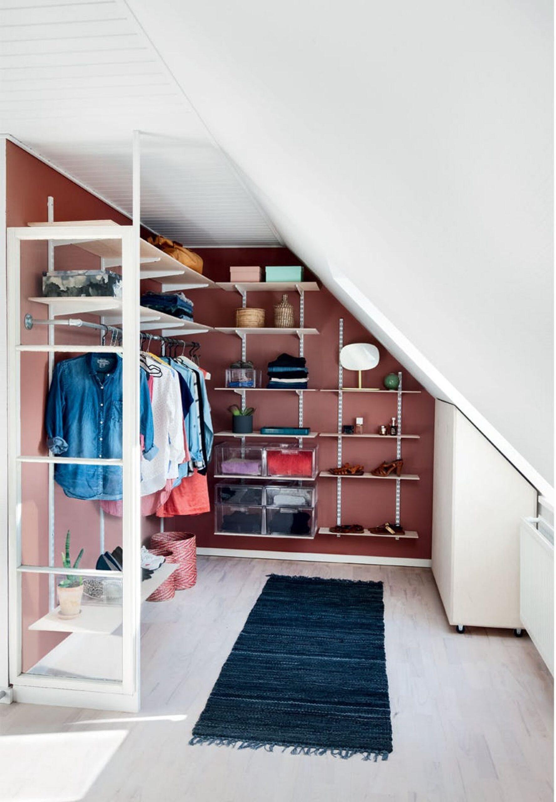 En anden interiørløsning, der kan være med til at skabe en praktisk indretning i dit walk-in closet er, at du så vidt det er muligt tilpasser hylder og bøjlestænger til rummets form. Det kan være en udfordring at skabe tøjopbevaringsmuligheder i et rum med skråvægge. Står du i sådan situation kan du med fordel købe et hyldesystem, hvor du selv kan justere på hyldernes højde og skære hylderne til, så de passer til væggens form. På den måde er du sikker på at udnytte rummets plads optimalt, og du vinder meget ekstra opbevaringsplads.
